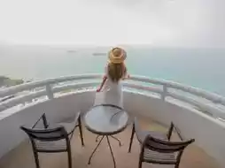 Go enjoy the sunset view from a rooftop overlooking the sea at D Varee Jomtien Beach, Pattaya. This accommodation is perfect for relaxing your mind and eyes, with a great mood and located right by Jomtien Beach—just cross the road and you're there. The highlight here is the stunning view from the nearly 40-story white building, offering a panoramic vista. The rooms are reasonably priced, and there's a restaurant where you can enjoy a seafood buffet dinner in the evening while listening to the soothing sound of the sea—it's truly wonderful.