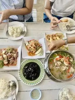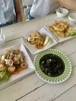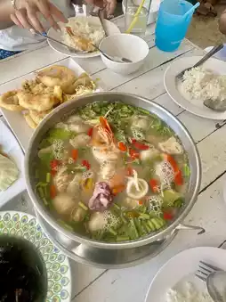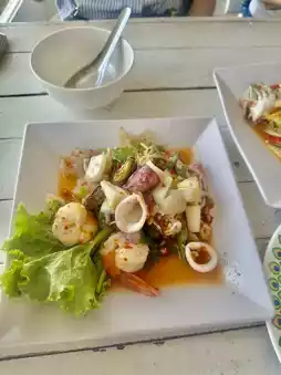 A seafood restaurant by the sea. Delicious food, delicious Tom Yum soup, reasonable prices, and a great view.