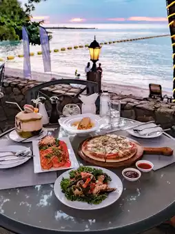 For dinner, we ate at the hotel's Breeze Beach restaurant, which had a great seaside atmosphere 🍝🦐🍕.