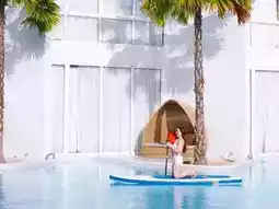 It features a waterslide, paddleboards, mini jet skis, and more.