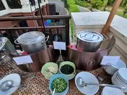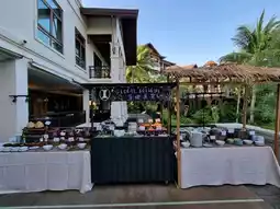 2. For dining, we only used the "Infinity Restaurant," which serves breakfast and all-day dining. As mentioned earlier, I was impressed with the breakfast. I recommend taking your time here. Breakfast starts at 6:30 AM, but seating is somewhat limited. There are both indoor and outdoor seating options. If you enjoy a sea view, sit outside, but it’s quite hot this time of year. In front of the restaurant, there’s a small alcohol station for those nursing a hangover and a little play area for kids to toss rings and decorate snacks. It’s delightful! However, the breakfast line lacks a dedicated kids’ corner or kid-friendly menu like some other hotels. Also, it’s a pity there’s no ice cream for breakfast.