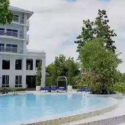 👉 A bright blue and white swimming pool that's incredibly photogenic.
