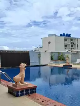 I just learned that they have two swimming pools: one in front of the hotel on the beach side and another on the third floor in the tower wing. This pool is a bit older, but it's convenient, with no long walks, and offers panoramic views of the skyscrapers.