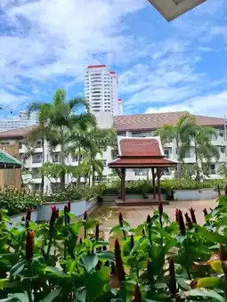This large hotel is located on Jomtien Beach. This tall building stands out, occupying an entire block between the beach road and the other side, easily avoiding traffic.