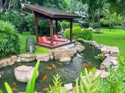 The overall atmosphere is lush with trees, providing shade. Along the walkway, there's a koi pond, a pavilion, and triangular pillows.