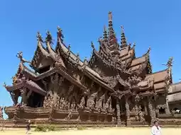 The temple itself is constructed entirely of wood, and is enormous and full of stunning details. Its shape is characterized by a majestic spire, surrounded by meticulously carved woodwork by skilled Thai craftsmen, without the use of a single nail. Every piece of wood is meticulously designed and arranged.