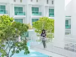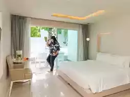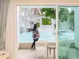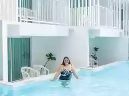 Relax, swim, and take photos in this clean, white accommodation. It's beautiful and clean, especially when the sun shines. You can take photos everywhere. This trip, Moo stayed in a Pool Access room. Open the door and you're right in front of the pool. Relax by the seaside on the balcony. If you're hungry, you can easily find Pink Salmo restaurant right in front of the hotel. There's also Blue Tank cafe and Yellow Sub Marine ice cream shop. Wong Amat Beach is just a 5-minute walk away, perfect for every style. ✨ #DriveToTravelNotToBangkok