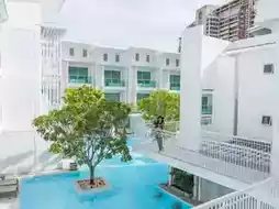 💙Minimalist Pattaya hotel, mini-hearted, emphasizing blue and white tones.