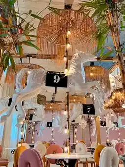 This spacious space offers numerous photo opportunities. The high ceilings flood the space with natural light, making it a perfect spot for photos. The décor blends European whimsy with a surreal atmosphere. There are plenty of photo opportunities to choose from, including a carousel, a rainforest, a retro-style bar, and a hotel theme.