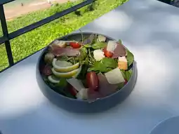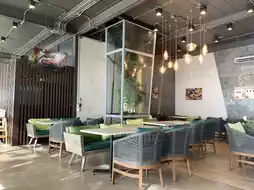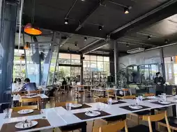 The restaurant is located on Pratumnak Hill, offering sea views. The atmosphere is open and airy, offering panoramic sea views. The decor is warm and modern, with wood tones and glass windows, allowing natural light to enter. Perfect for a coffee, wine, or a special meal.