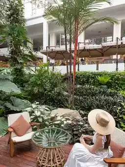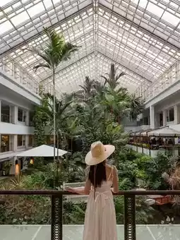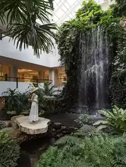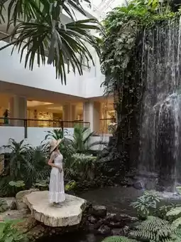 From the moment I stepped into the hotel, I was impressed. The design incorporates gardens, trees, and a man-made waterfall,