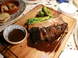 🍖 The Spanish-style menu features pork belly with Spanish sauce, barbu Greek salad, grilled chicken marinated in harissa sauce, Spanish-style garlic shrimp, Padron peppers, Spanish-style crab omelet, and frutti di mare pizza. A must-try is the Australian short ribs braised in red wine, braised for 24 hours. The meat is incredibly tender and delicious. Finish off with a chocolate cake for dessert.