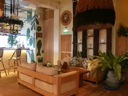 💺 The cool seating area is decorated with wood tones and greenery, creating a modern, natural feel.