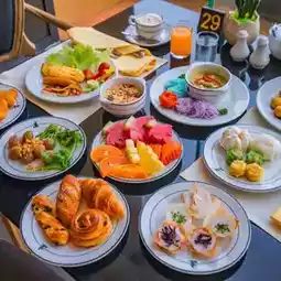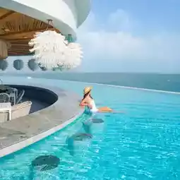 The highlight is the Sky Aquarium Pool & Bar, offering panoramic views. There's a bar where you can relax with a drink, and a children's play area. The evening light is especially beautiful, as it's the longest swimming pool in Thailand. There's also a jacuzzi below. There's also a spa and a kids' club. There's also a Japanese, Thai, and international restaurant, and a beachfront restaurant for strolling and taking photos. It's all in one place, so you hardly need to go anywhere else.