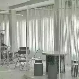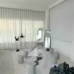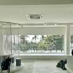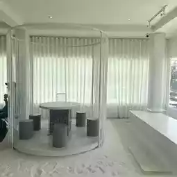 A minimalist cafe in Pattaya with a white and black tone, decorated with white sand and large glass windows offering a view of the sea and sunlight. Relaxing vibes with signature menu items like pies and excellent service. ✨
