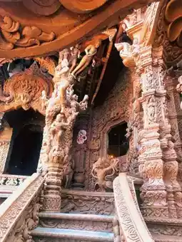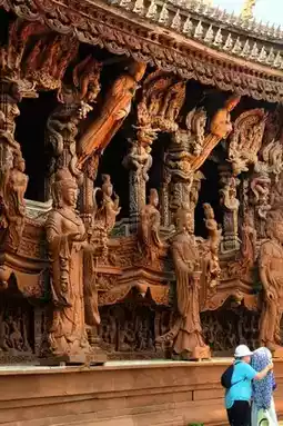 Standing before the tens of meters high wooden sculpture hall, humanity suddenly feels small. The Brahman myths carved around the beams and pillars, the compassionate gaze from the lotus pedestals, make one forget to raise their phone, wanting only to press their palms together in prayer.