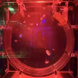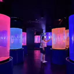This zone is a dark room with colorful lights from jellyfish tanks.
