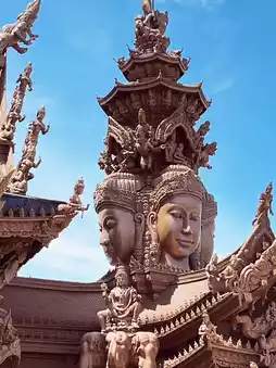Crafted entirely from wood, this visionary temple in Pattaya is a living symphony of axe and chisel. Every surface breathes with intricate carvings – celestial dancers, sacred elephants, and mythological guardians woven into teak and redwood.