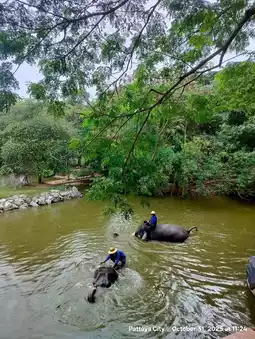 📍 Mong Chang Cafe, a cafe filled with animals. Enjoy a mini zoo featuring Grandma Elephant, Baby Elephant 🐘, Meerkat (named Pookpik, so adorable!), Lemurs, Foxes 🦊, Little Rabbits 🐇, Snakes 🐍, Goats 🐐, Macaws 🐦, Leopard Cats 🐱, Cows 🐮, Deer 🫎. Thais get in free, but you can also watch the fantasy show where the baby elephants bathe. Just order one drink per person and you're ready to watch the show.