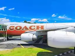 Start by admiring the impressive exterior—snap a sunny photo of the "COACH" logo on the airplane fuselage set against blue skies and fluffy white clouds. Head inside and wander through the modern retail hall.