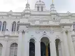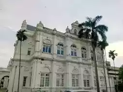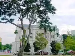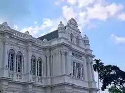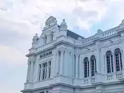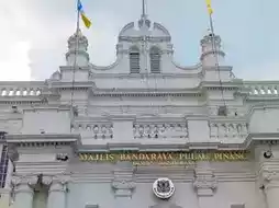 Penang City Hall is a striking white colonial-style building located by the sea in George Town. Built in 1903, it is a popular spot for photography, showcasing beautiful architecture that blends European and Asian styles. Nearby, there is a public park where visitors can relax and stroll. The City Hall is situated next to the Penang Town Hall, a yellow building.