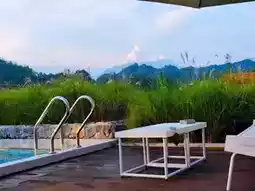The rain-washed mountains stand out with sharp contours, while mist lingers halfway up the slopes like a veil of gauze. Sitting on the terrace with a cup of hot tea🍵, let go of all thoughts—just watch the raindrops fall, listen to the rustling of the wind through the reeds, and embrace the tranquility and relaxation wrapped in nature.
