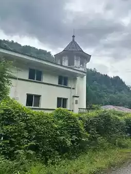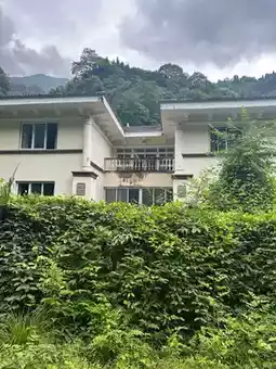 🐷 After scrambling and tumbling down the mountain, a gravel road extends to the right. This road felt a bit strange. On the left side was a river, with a small waterfall on the opposite mountain, and even an abandoned guesthouse hotel by the roadside. The weathered walls looked eerie. I was wondering why this place, which seemed to have been developed before, was so desolate! (Later I learned this was the site of a major flood accident during water play in Pengzhou years ago, so the entire area was shut down.)