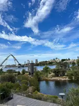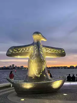The iconic BHP Billiton Water Park, with its interactive water features, is a fantastic place for families to have fun, making it a lively spot for children and adults alike. Additionally, the striking bridge and the nearby artwork, such as the famous"Eliza" sculpture, add a unique artistic flair to the area, perfect for capturing memorable photos.