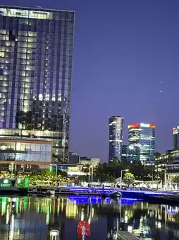When the sun sets, Elizabeth Quay transforms into a glittering riverside gem. The skyline reflects beautifully on the Swan River, and the bridge lights up in soft changing colors — perfect for evening strolls or photos.