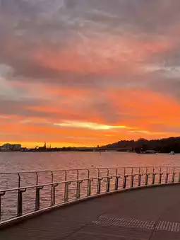 Watch as the sun melts into the river, setting both water and sky ablaze while the golden penguin sculpture appears to swim through flames. The signal tower stands as a modern monolith against this daily color explosion – creating the perfect fusion of nature, art and urban design.