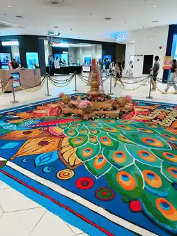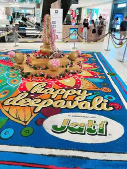 Starling Mall is glowing with festive spirit this Deepavali, thanks to the vibrant decorations by Jati. The centerpiece of the celebration is a stunning kolam design — a traditional Indian floor art — created with colorful patterns and intricate details that symbolize prosperity and good fortune. The vivid hues and symmetrical motifs draw in visitors, capturing the essence of the Festival of Lights.