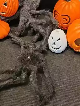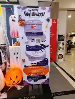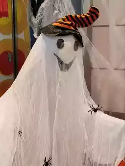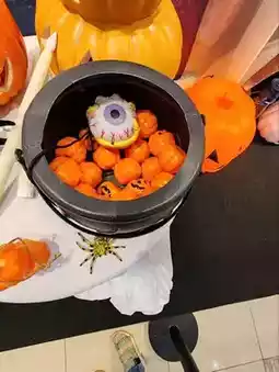 The Halloween decorations in the shopping mall have brought a strong festive atmosphere. Pumpkin lanterns of various sizes take center stage—some wearing witch hats, others with quirky designs. White ghosts float in the air, while elements like spider webs and plush spiders are scattered around, creating a scene that is both playful and slightly eerie. At the center display table, a black cauldron holds small pumpkins and a large eyeball, with candlelight flickering, inviting everyone to join in this ghostly celebration.