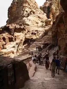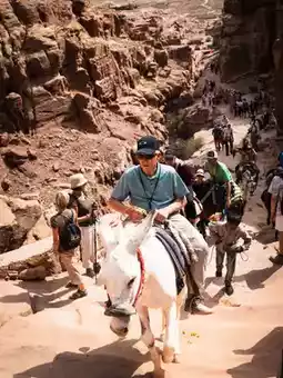 But soon the silence fades. Hundreds of stone steps ahead become a bustling path of tourists, passing each other up and down. Some ride donkeys, others camels, and some carry water and supplies, as if they were still serving in ancient caravans.