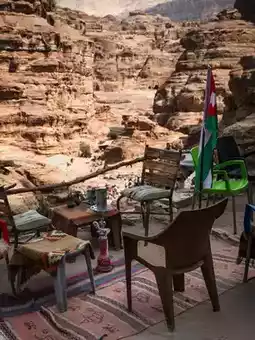 At a small cliffside tea shop, plastic chairs and old rugs greet guests alongside Jordanian flags. It's a resting spot steeped in the stories of the owner—a Bedouin who still makes a living amidst the ancient ruins.