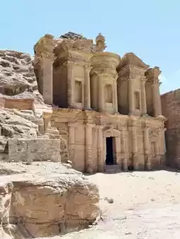 Petra is a city carved into rock, formed by the Nabataeans around the 2nd century BC. It was a key location for caravan trade.