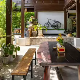 Today, Nuch will take you to a classic cafe that is open in a Thai house, surrounded by trees. This house is over 100 years old. Inside, there are seats under the house. On the upper part of the house, there is a hall and a bedroom that still has antique bedding. We can go up and take pictures.