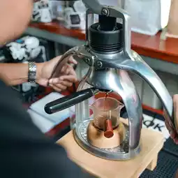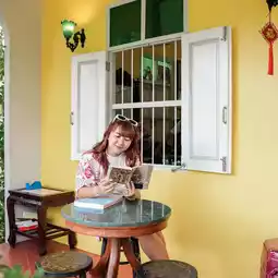 Wearing a shawl and sipping coffee in an ancient Thai house