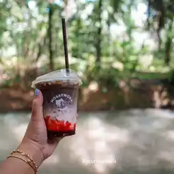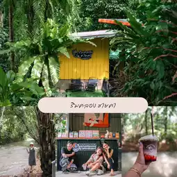 Next is this, Rim Khlong, Chaika, Ban Ton Din, Phang Nga, with a stream atmosphere. When I went, the water was very high. I couldn't put my feet in the water. 🤭 This is the shop that has delicious and spicy food. There is also a cafe inside. Mosaymoka Slow Bar Coffee, a chic shop with a cute barista. Let's go try it.