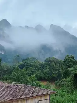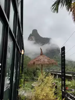 Okay, I went to Khao Sok, Surat Thani. On the Surat Thani-Phang Nga road (Route 410), near Khao Sok, there is a cafe right on the road called Bridge Hill Cafe. The view is great. I went when it was raining. The fog and rain fell, contrasting with the high and steep mountains in that area, which was unusually beautiful.