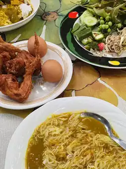 You can choose from five different khanom jeen curries, along with a large tray of fresh vegetables you can pick up yourself. They also offer fried chicken, roast pork, and delicious desserts.