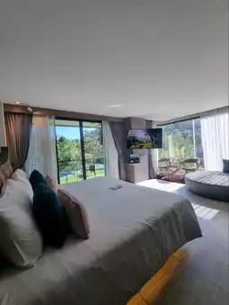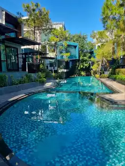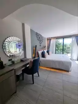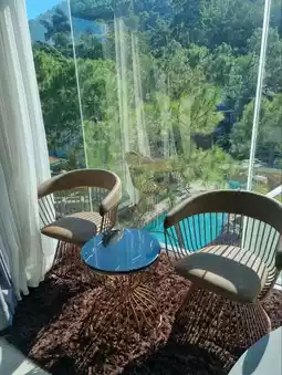 The hotel has a building and a villa type. There are 2 types of buildings on top of the building. There is a rooftop viewpoint where you can go up and sit and enjoy the mountain atmosphere. You can see the view in 360 degrees. There are Deluxe Rooms, Deluxe Exclusive, Grand Deluxe, and Corner Suite Rooms. If you want privacy, there are also Villa rooms. Private Villa and Grand Villa 2 Bedrooms. I chose to stay in a Deluxe Exclusive Room. The room was spacious, clean, with a large bed and comfortable bed. The facilities were complete. There was a large round sofa close to the glass for a comfortable view. The bathroom was divided into a wet and dry zone. The room had glass walls on both sides. You could see the swimming pool, forest, and mountains. The atmosphere was great.