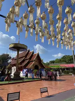 The Yi Peng festival is approaching, and the surrounding area is decorated with Northern-style lanterns, also known as Lanna lanterns, in a variety of colors.