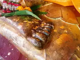 The religious demons found out, so they sneaked in and cut off the Buddha image's head, causing great sadness to the Buddhists of Phetchaburi. Later, they molded a new Buddha head, connected it to the original Buddha image, and restored it with lacquer and gold leaf.