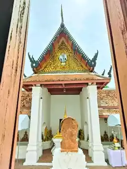 🌸 Wat Yai Suwannaram Worawihan is a long-standing temple in Phetchaburi, renowned for its beautiful and pristine late Ayutthaya architecture. Inside the ubosot (ordination hall) is a magnificent principal Buddha image. The walls are covered in masterful murals, vividly depicting the life of the Buddha. The sermon hall, constructed entirely of golden teak and intricately carved, is one of Thailand's most historically and artistically valuable wooden buildings.