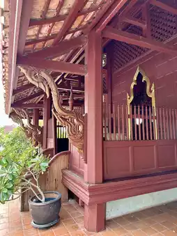 Today, the Teaching Hall stands as a masterpiece of Thai craftsmanship, adorned with finely carved teak panels and timeworn murals that glow in the soft light filtering through its ancient wood. Every beam and carving seems to whisper the legacy of faith, humility, and gratitude that binds teacher and king across the centuries.