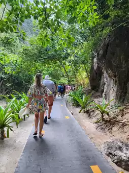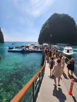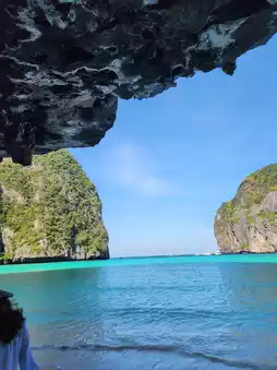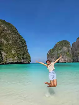 Upon arriving at Maya Bay, the first thing that strikes you is the beauty of the fine white sandy beach, the crystal-clear sea water that reveals the sandy bottom, and the backdrop surrounded by towering limestone cliffs. This place is like a dream come true, perfect for taking photos, strolling, or even just sitting and enjoying nature.