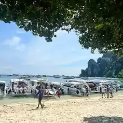 🏝️ The landmarks or highlights here include taking a long-tail boat to see Ao Pileh or Pileh Lagoon, Viking Cave or Swallow Cave, Ao Ling, and seeing the white sandy beach and clear water at Ao Maya, which is a bay famous for filming The Beach, which made this bay famous all over the world.