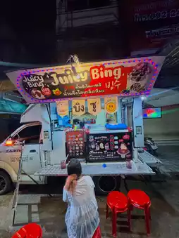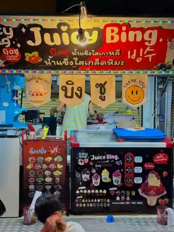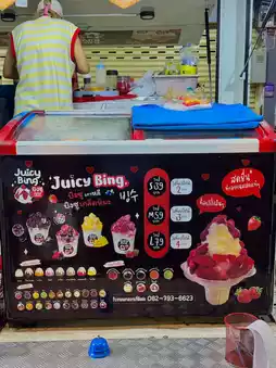 #GetDiscountsWithoutLuck! This small roadside bingsu shop in Phitsanulok is called Juicy Bing. They offer three sizes: S, M, and L, so you can choose your favorite. The shaved ice comes in a variety of flavors, including fresh milk, chocolate, Thai tea, green tea, Taiwanese milk tea, and even strawberry. You can choose your favorite toppings. The flavors are absolutely delicious! If you're passing by, stop by and enjoy!