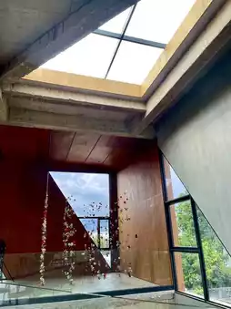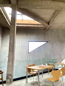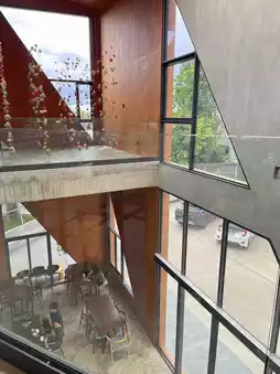 This cafe serves drinks, desserts, and food and snacks. The shop is beautiful and chic, with a black-and-gray theme. There are plenty of photo spots, a cool building design, and plenty of seating, perfect for working.