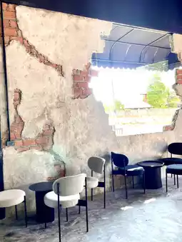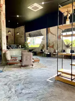 The shop is strikingly beautiful, with a loft-style, exposed concrete floor contrasted by large glass windows all around, allowing natural light to flood the space. The high ceilings create a spacious, airy atmosphere. The air conditioning is cool, the music is good, and there's plenty of seating. There are board games to play. Whether you're coming alone, as a couple, with a family, or with a group of friends, it's perfect for a quick photo opportunity. The lighting is beautiful.
